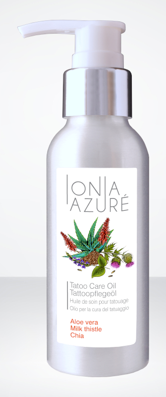 • Unterstützen Sie Ihre Haut dabei, sich schneller nach dem Tätowieren zu erholen mit IONIA AZURÉ Tattoopflegeöl aus 33.3% BIO-Aloeöl, 33.3% BIO-Mariendistelsamenöl und 33.3% BIO-Chiaöl.