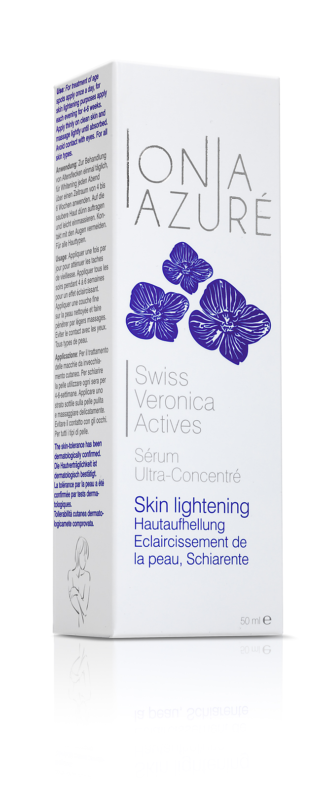 Swiss Veronica Actives ist ein hochwirksames Hautaufhellungsserum aus natürlichen Inhaltsstoffen und BIO-Alpinen-Pflanzenextrakten für eine intensive Aufhellung und Behandlung von Altersflecken und Pigmentflecken.